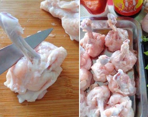 - Cánh gà rửa sạch với nước muối rồi dùng dao tách thịt ra khỏi xương ở phần đầu rồi dóc thịt ngược trở lên phía bầu cách, để trơ xương ra, kéo thịt xuống bến dưới