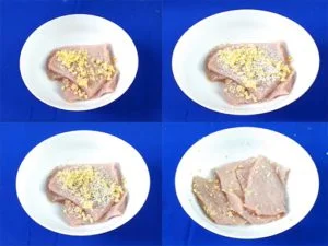 Ướp thịt với một ít tiêu, muối, đường trong vòng 10 phút để gia vị thấm vào thịt.  Sau đó gắp miếng thịt đã ướp qua tô bột mì lăn qua lăn lại rồi gắp lên, lắc lắc cho bột cũ rớt ra. Tiếp tục nhúng thịt vào đĩa trứng và sau cùng là đĩa bột chiên xù, nhớ lắc lắc cho bột chiên rũ ra.