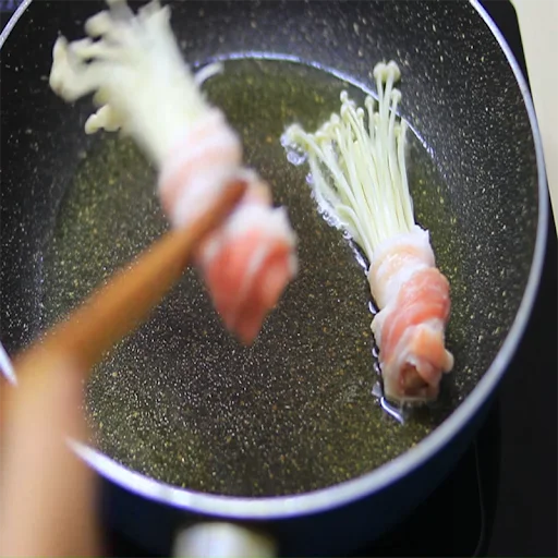 Thái miếng thịt thành miếng dày tầm 1,5cm, bỏ nấm lên và cuộn chắc tay. Dùng hành lá cột lại. Sau đó mang đi áp chảo. Lật từng miếng thịt, khi thịt chín, nấm giòn thì gắp ra, để ráo dầu.